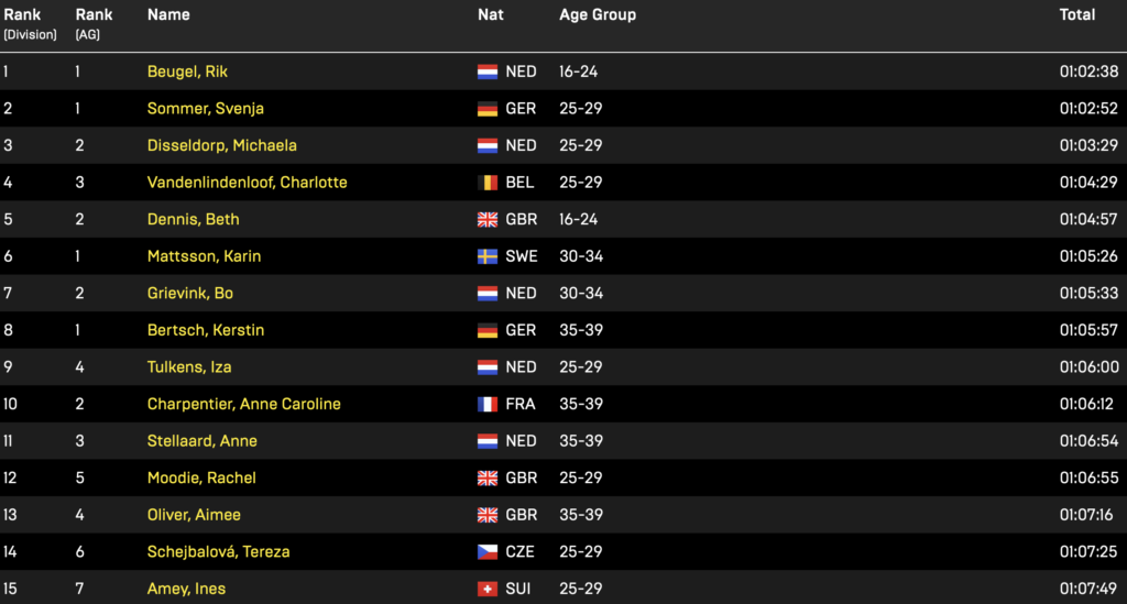 Chez les femmes, la victoire revient à Rik Beugel en 1:02:38, devant l’Allemande Svenja Sommer (1:02:52) et la Néerlandaise Michaela Disseldorp (1:03:29). Le podium confirme une nouvelle fois la forte densité des athlètes venues d’Europe du Nord.