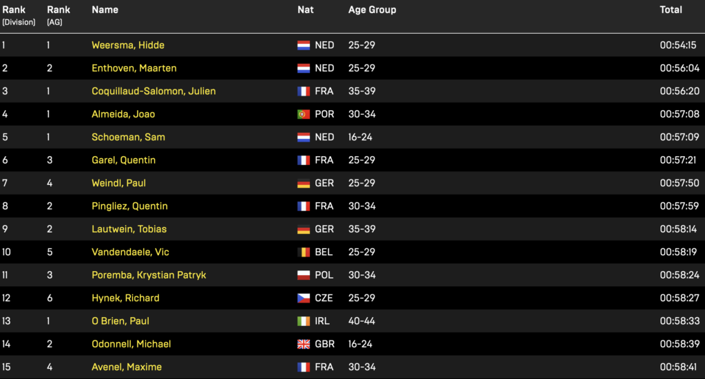 La victoire revient à Hidde Weersma, qui s’impose en 54:15 au terme d’une course très maîtrisée. Le Néerlandais devance son compatriote Maarten Enthoven (56:04), confirmant la domination locale sur cette édition.
