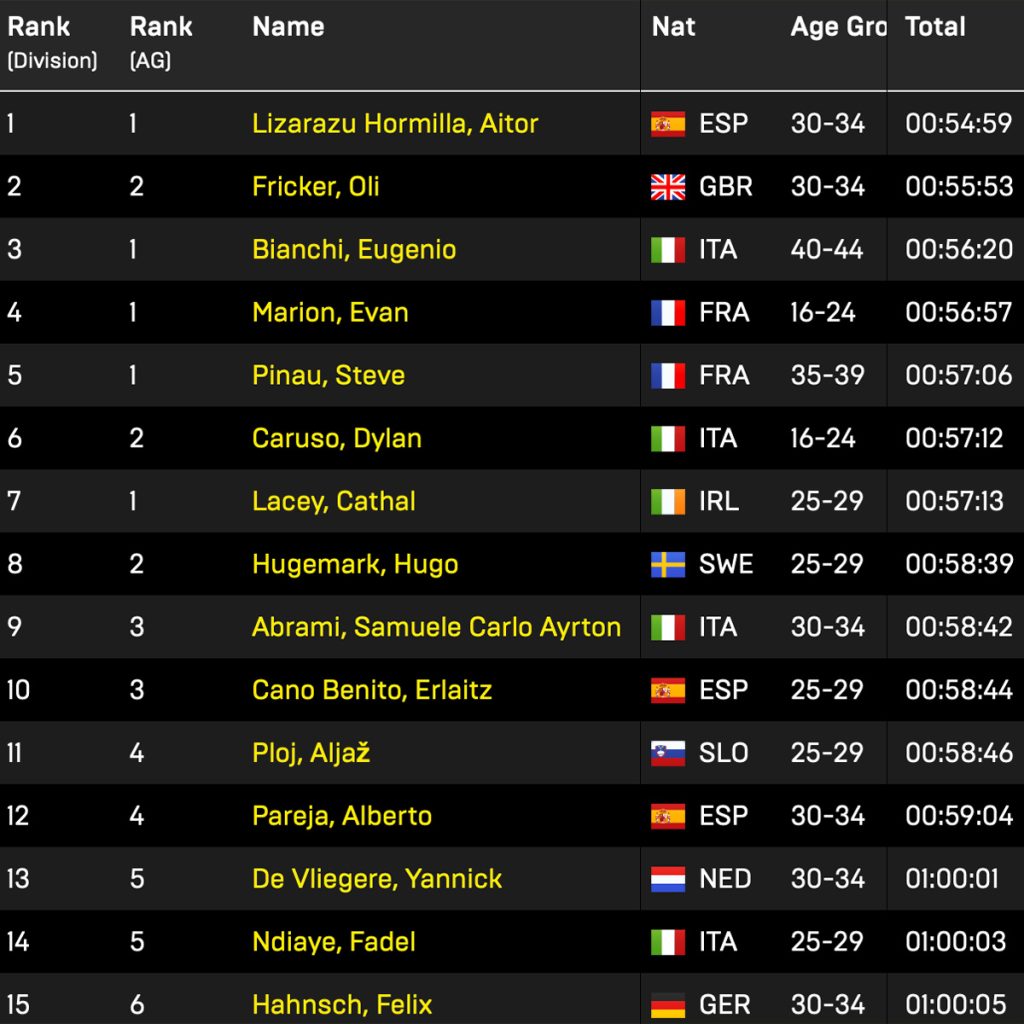 La victoire revient à l’Espagnol Aitor Lizarazu Hormilla en 54:59, devant le Britannique Oli Fricker et l’Italien Eugenio Bianchi. Côté français, ils ne sont que deux dans le top 15, mais ils frappent fort. Evan Marion signe une très belle 4e place en 56:57, au pied du podium. Une performance solide qui confirme son niveau face à l’élite européenne.