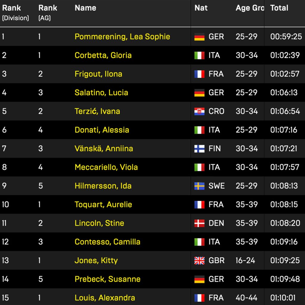 Elle devance l’Italienne Gloria Corbetta et surtout la Française Ilona Frigout, qui monte sur le podium avec une 3e place en 1:02:57. Derrière elle, deux autres Françaises intègrent le top 15 :