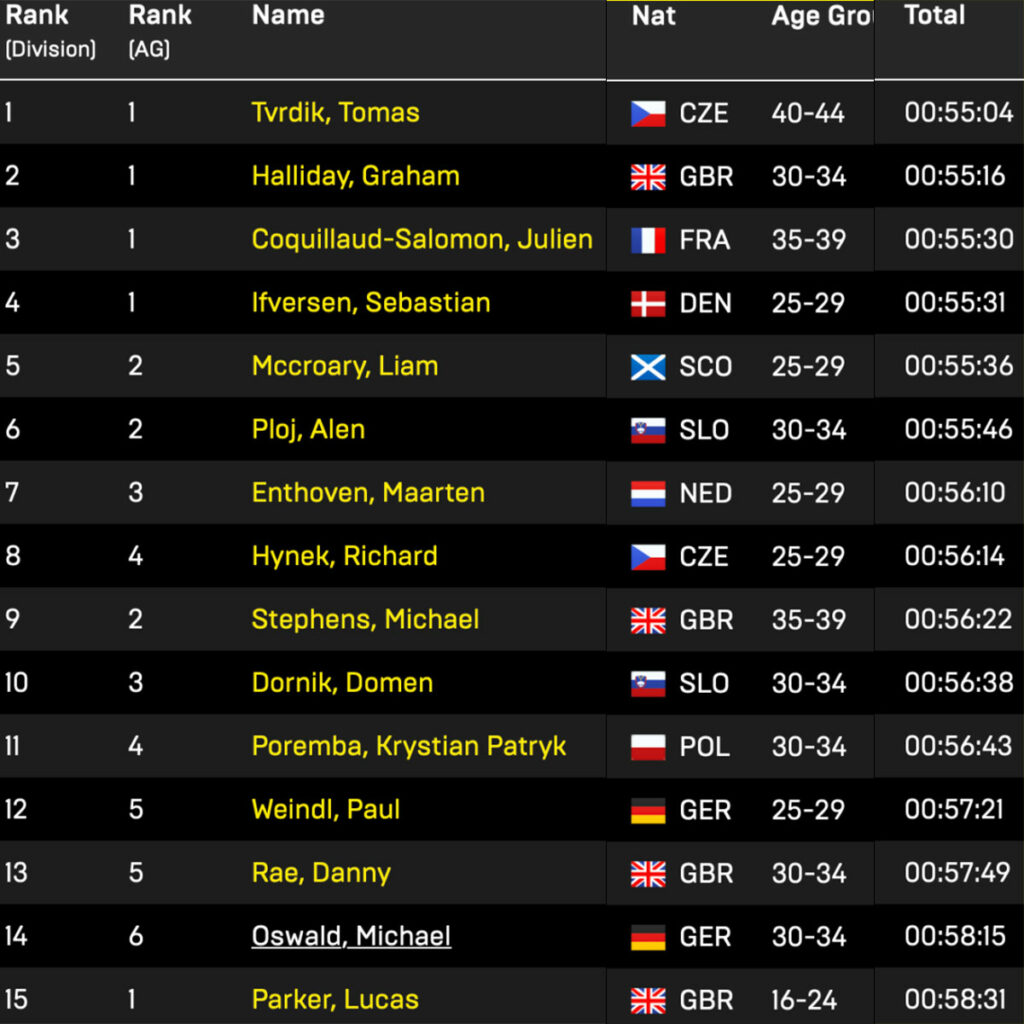 La victoire revient au Tchèque Tomas Tvrdik en 55:04 (catégorie 40-44), juste devant le Britannique Graham Hallidayen 55:16. Mais la performance française du week-end est signée Julien Coquillaud-Salomon. Le Tricolore prend la troisième place en 55:30 (35-39). Un chrono très solide, à seulement 26 secondes de la victoire. À ce niveau, l’écart est minime. Quelques secondes sur un sled push. Une transition un peu plus rapide. Une gestion parfaite des wall balls. Et le classement peut basculer.