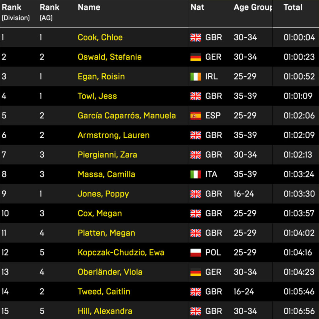Côté féminin, la Britannique Chloe Cook l’emporte en 1:00:04, tout près de passer sous la barre symbolique de l’heure. Elle devance l’Allemande Stefanie Oswald (1:00:23) et l’Irlandaise Roisin Egan (1:00:52). Là aussi, les écarts restent serrés. Plusieurs athlètes terminent entre 1h00 et 1h02, preuve d’un niveau très homogène. La gestion du run et la régularité sur les stations ont fait la différence. À Katowice, personne ne s’est effondré. Tout s’est joué sur la constance.