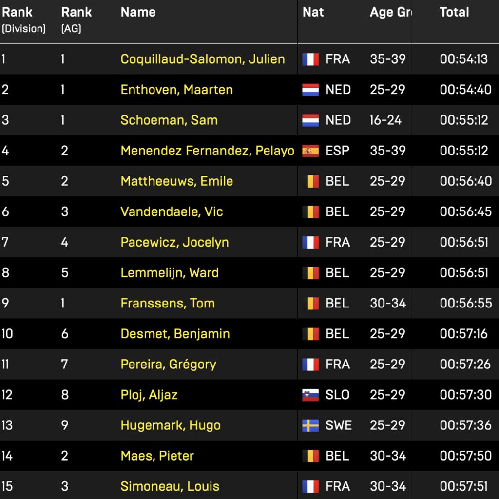 Chez les hommes, la performance française est tout simplement remarquable. Julien Coquillaud-Salomon s’impose avec autorité en 54:13, signant une victoire solide dans une course très disputée. Derrière lui, la concurrence est internationale, avec notamment Maarten Enthoven et Sam Schoeman qui complètent le podium. Mais la vraie satisfaction vient de la densité française dans le top 15.