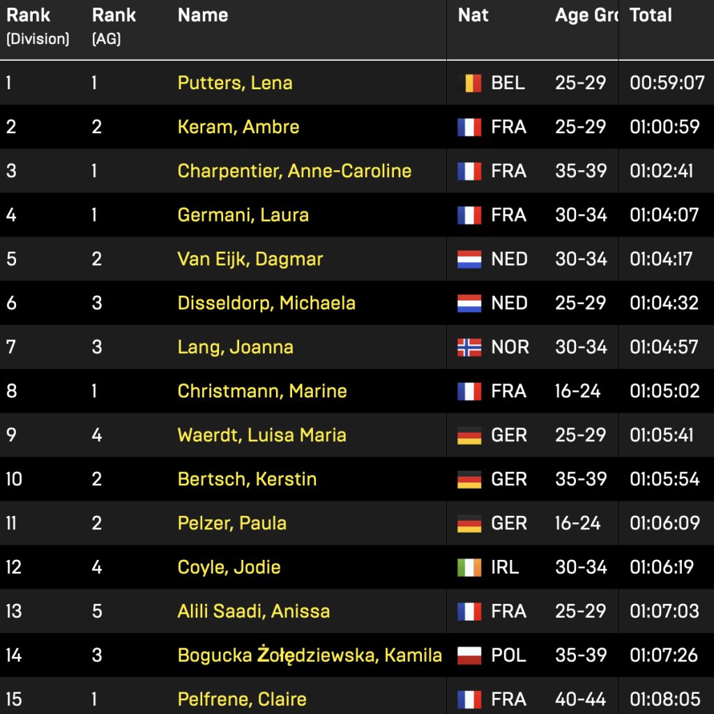 Chez les femmes, la victoire revient à la Belge Lena Putters en 59:07, mais derrière, la France impressionne par sa densité. Ambre Keram prend une très belle 2e place, confirmant son statut sur la scène HYROX ®. Mais surtout, les Françaises sont omniprésentes dans le top 15 :