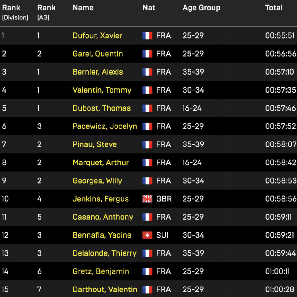 Le grand vainqueur s’appelle Xavier Dufour, impressionnant en 55:51. Un chrono solide qui lui permet de devancer Quentin Garel, deuxième en 56:56, lui aussi sous les 57 minutes. Le podium est 100 % français puisque Alexis Bernier complète le top 3 en 57:10. Mais le fait marquant de cette édition niçoise reste la densité incroyable du classement :