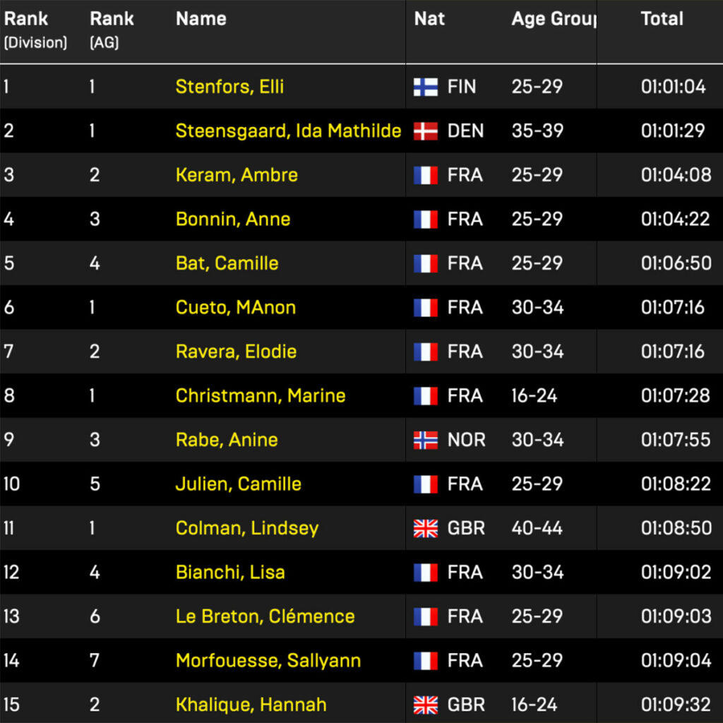La victoire revient à la Finlandaise Elli Stenfors, solide en 1:01:04, devant la Danoise Ida Mathilde Steensgaard (1:01:29). La première Française, Ambre Keram, monte sur la troisième marche du podium en 1:04:08, confirmant sa régularité sur le circuit. Derrière elle, plusieurs Tricolores s’illustrent dans le top 15 :