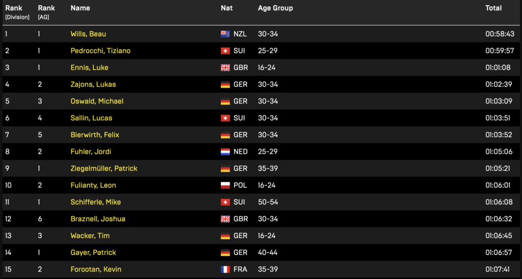 Chez les hommes, la victoire revient à Beau Wills (Nouvelle-Zélande), auteur d’une course très maîtrisée en 58:43. Il devance le Suisse Tiziano Pedrocchi (59:57), porté par le public local, et le Britannique Luke Ennis (1:01:08).