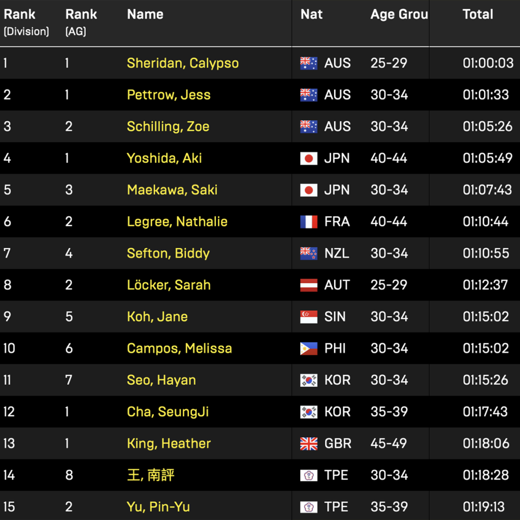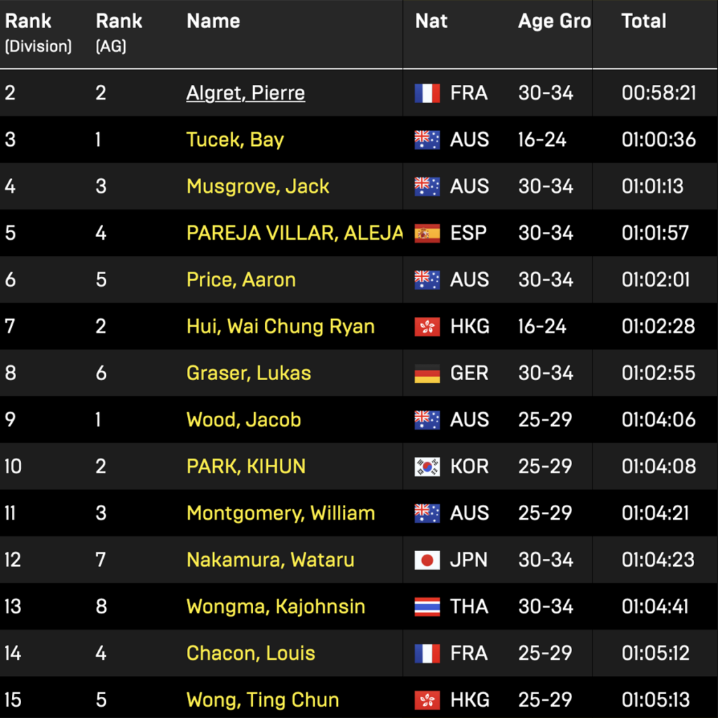 Autre performance française notable : Louis Chacon termine 14e en 1:05:12 (25-29). En effet, dans un top 15 dominé par des Australiens et des athlètes asiatiques, sa présence confirme la capacité des Français à performer à l’international.